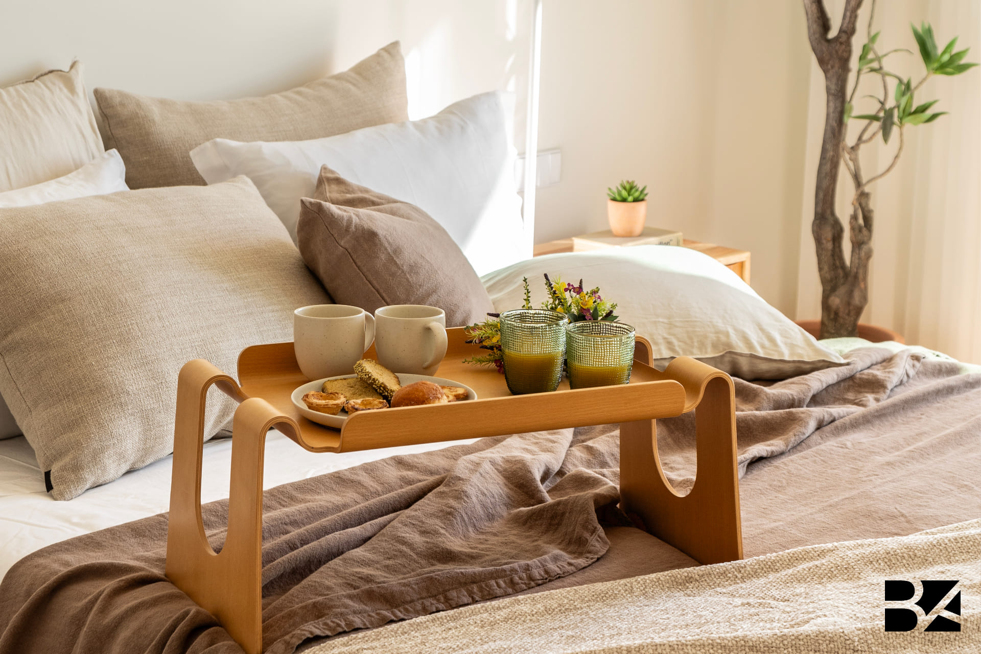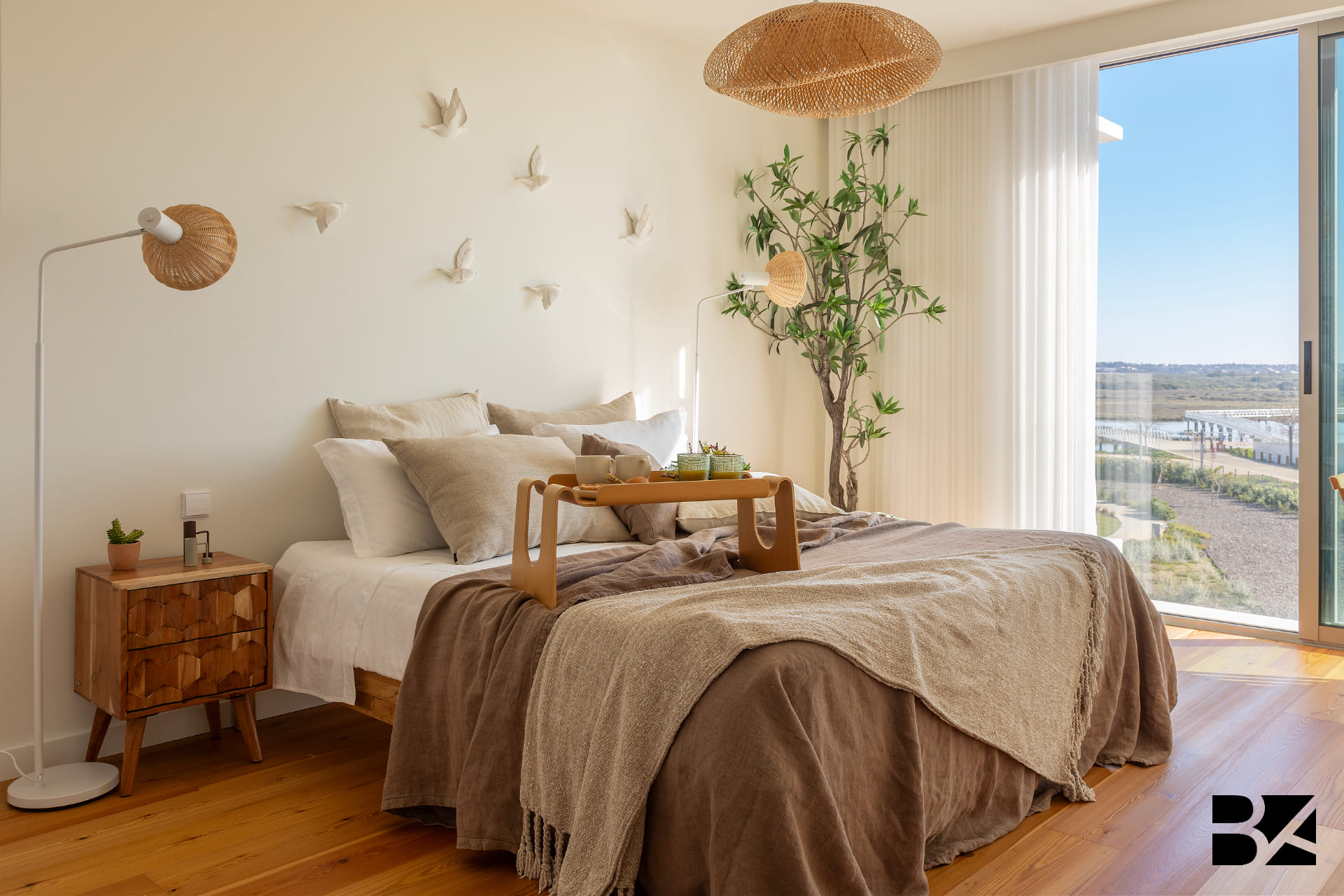 This bedroom captures the essence of the Algarve through soft tones, natural materials, and carefully chosen details. Light wood furniture, woven straw lamps, and subtle decorative accents evoke the calm of southern Portugal. With a minimalist and welcoming design, the space invites rest and well-being, reflecting the quiet beauty of the surrounding nature.