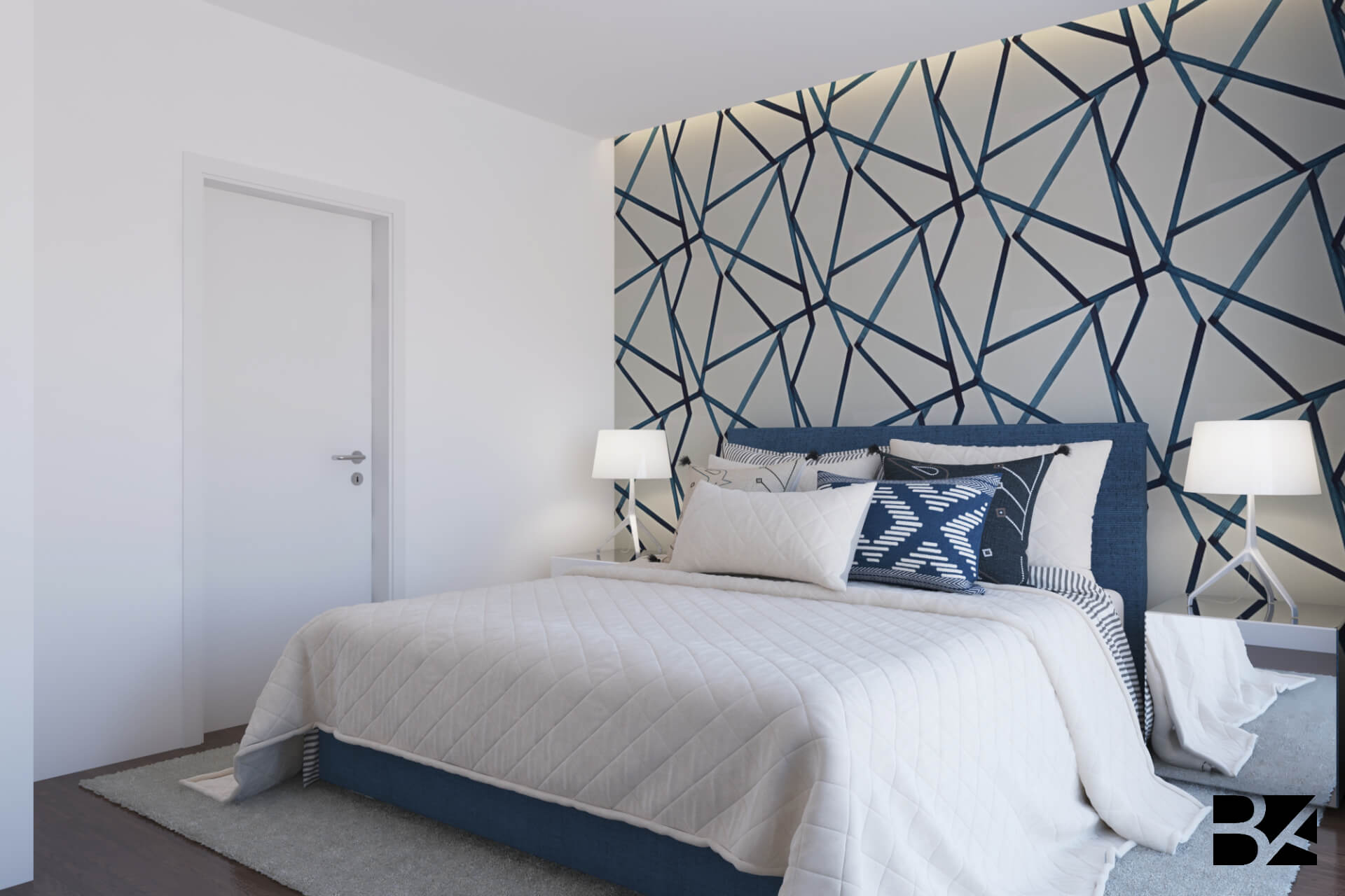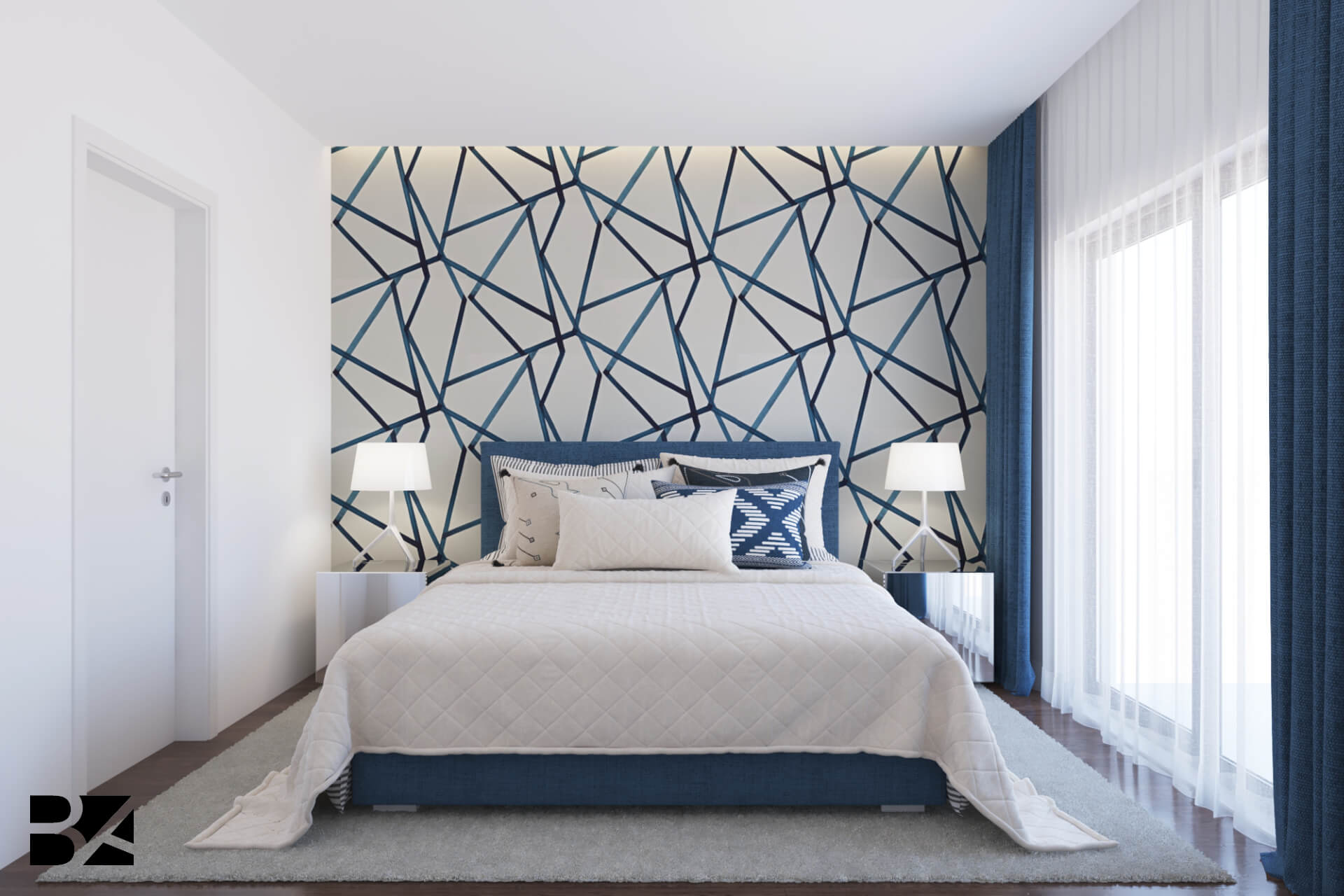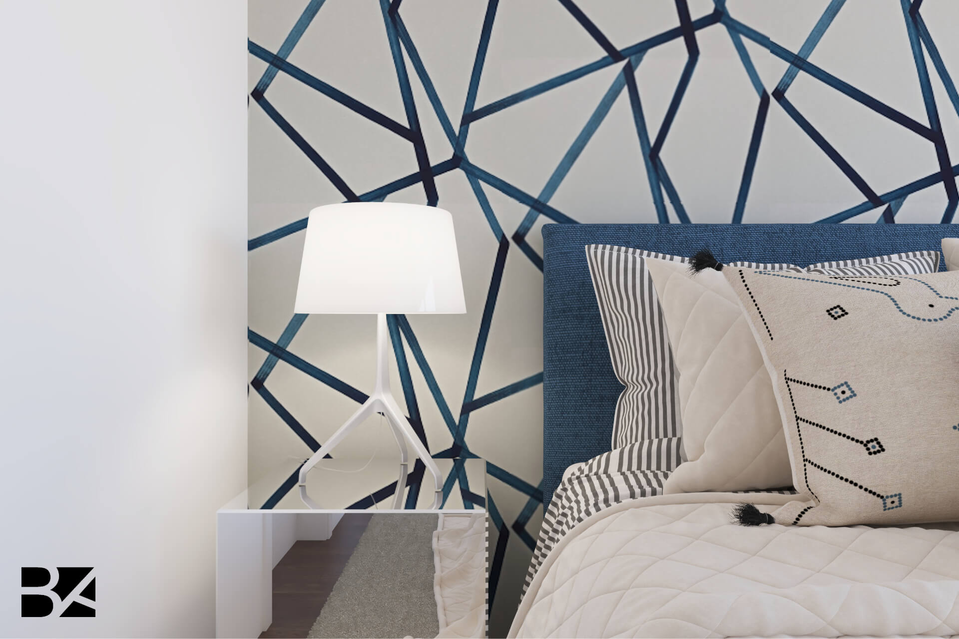 This bedroom blends glacial tones and soft textures to create a tranquil retreat. The blue and white wall evokes icy landscapes, while the blue headboard and quilted bedding offer warmth and simplicity. Minimalist lamps, blue curtains, and decorative accents reflect the calm and elegance of Alaska’s natural scenery.