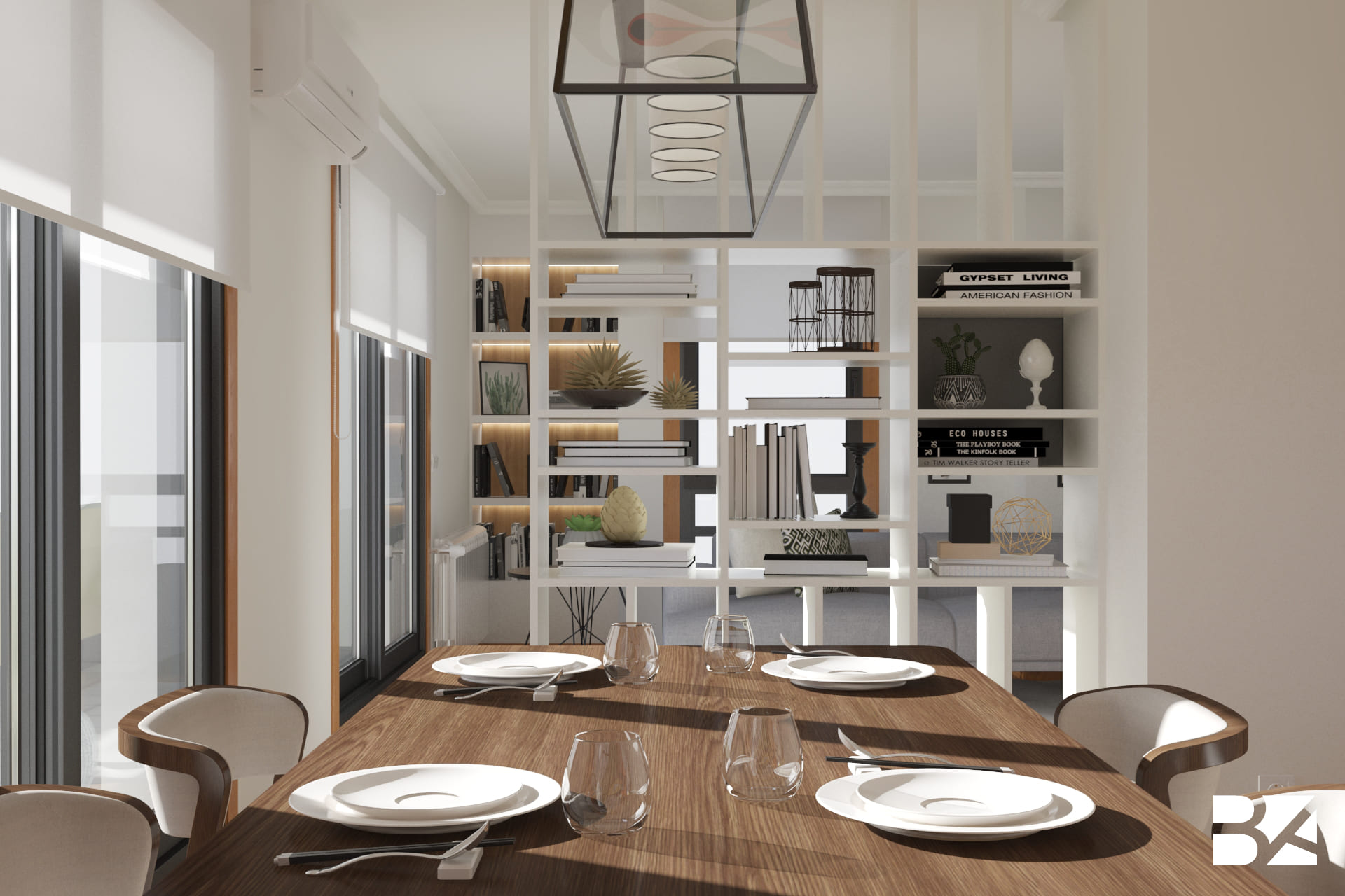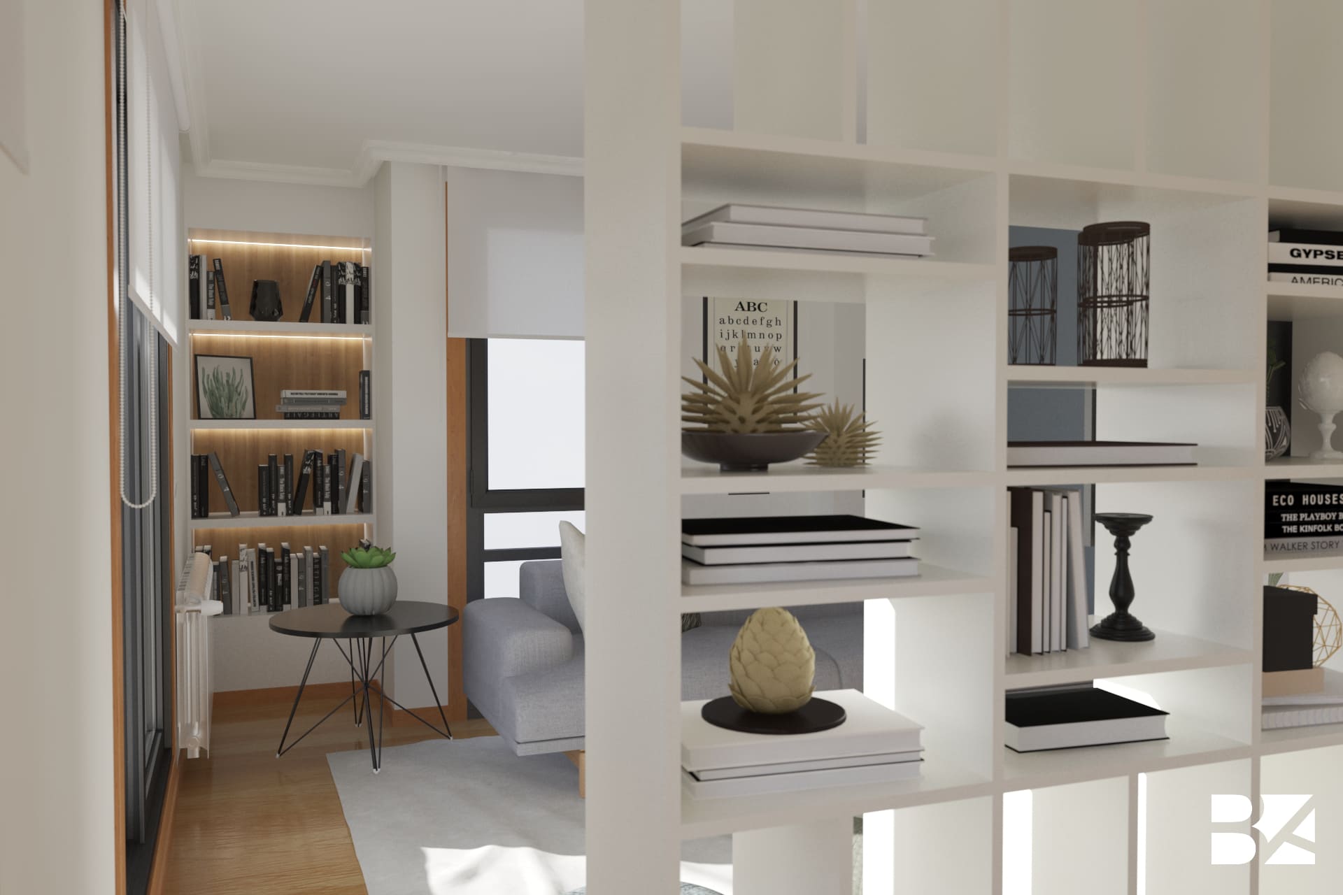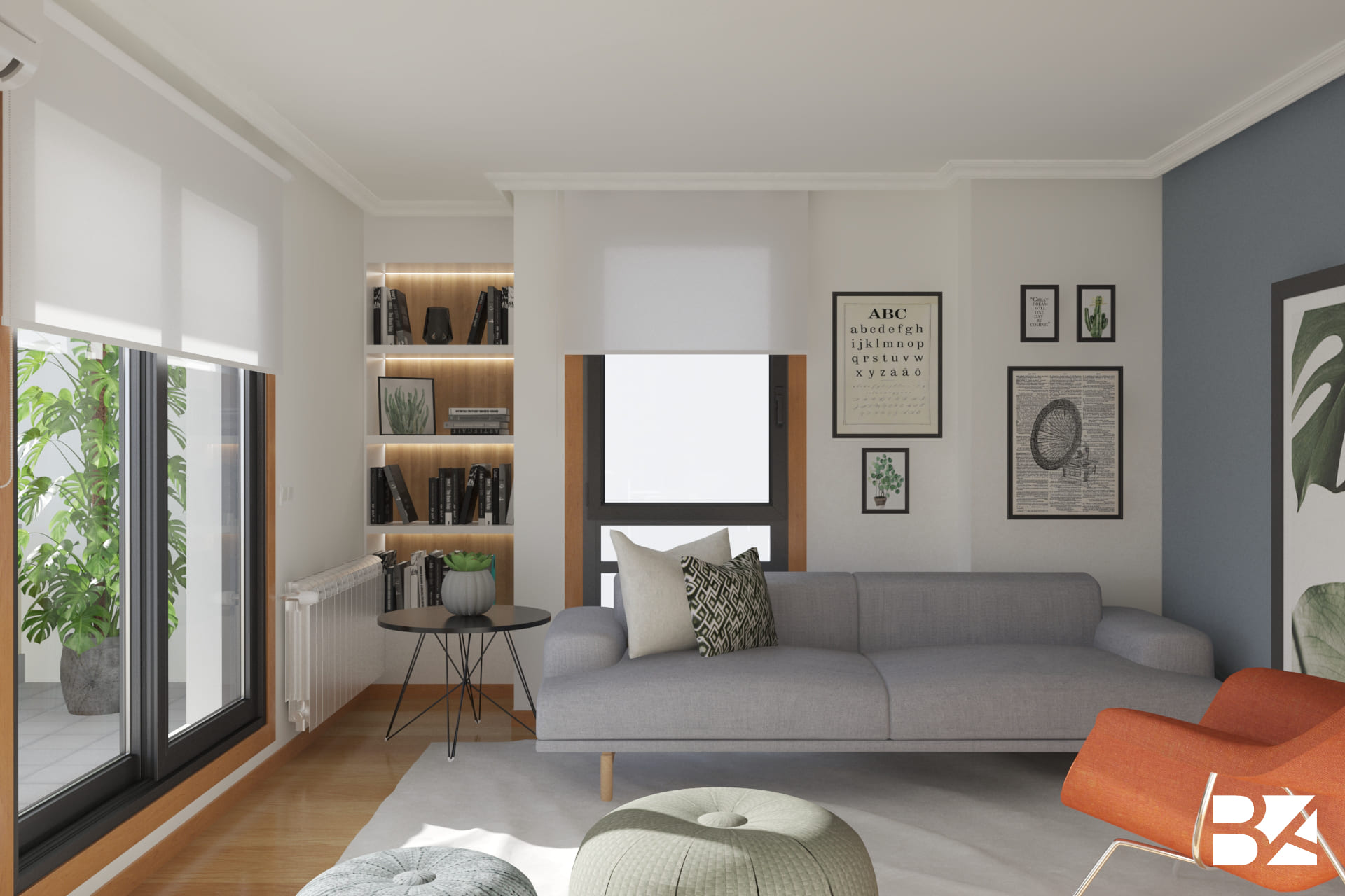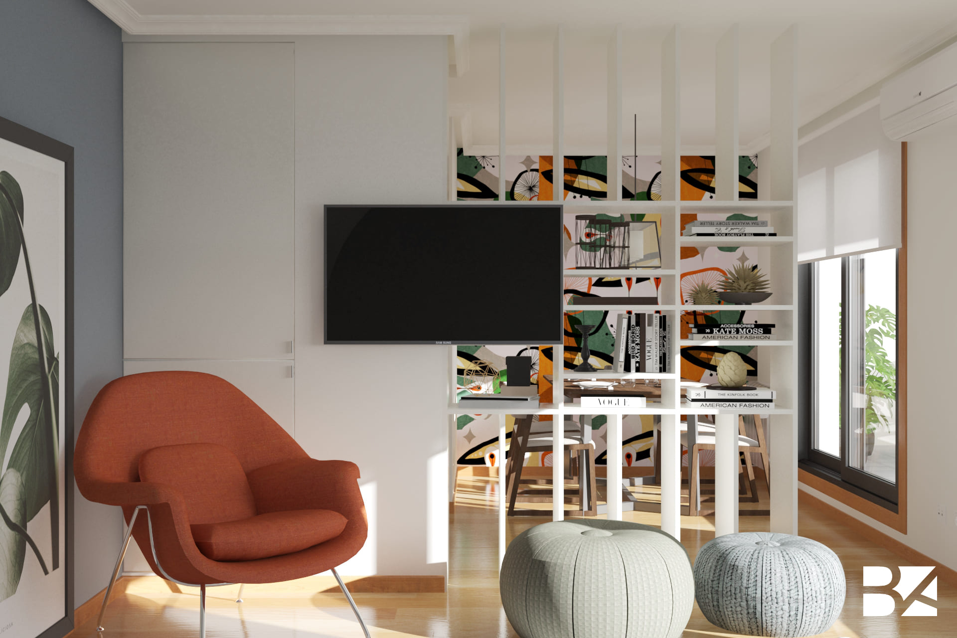 This space captures the vibrant essence of Barcelona through a bold and modern composition. The wallpaper in vivid colors takes center stage, echoing the visual daring of the city’s creative districts. A terracotta armchair adds warmth and sophistication, contrasting beautifully with the soft blue wall that brings chromatic balance.