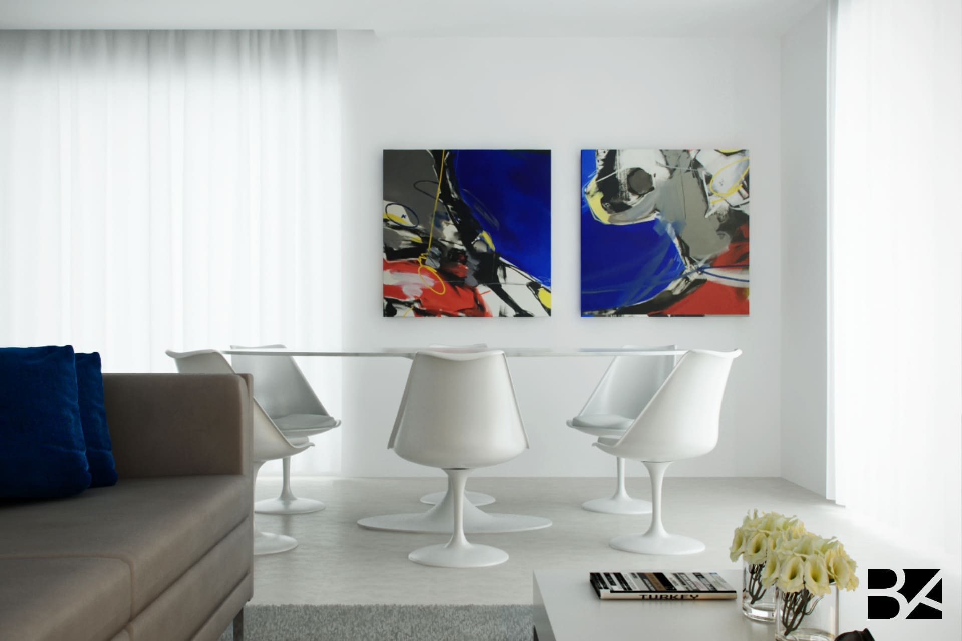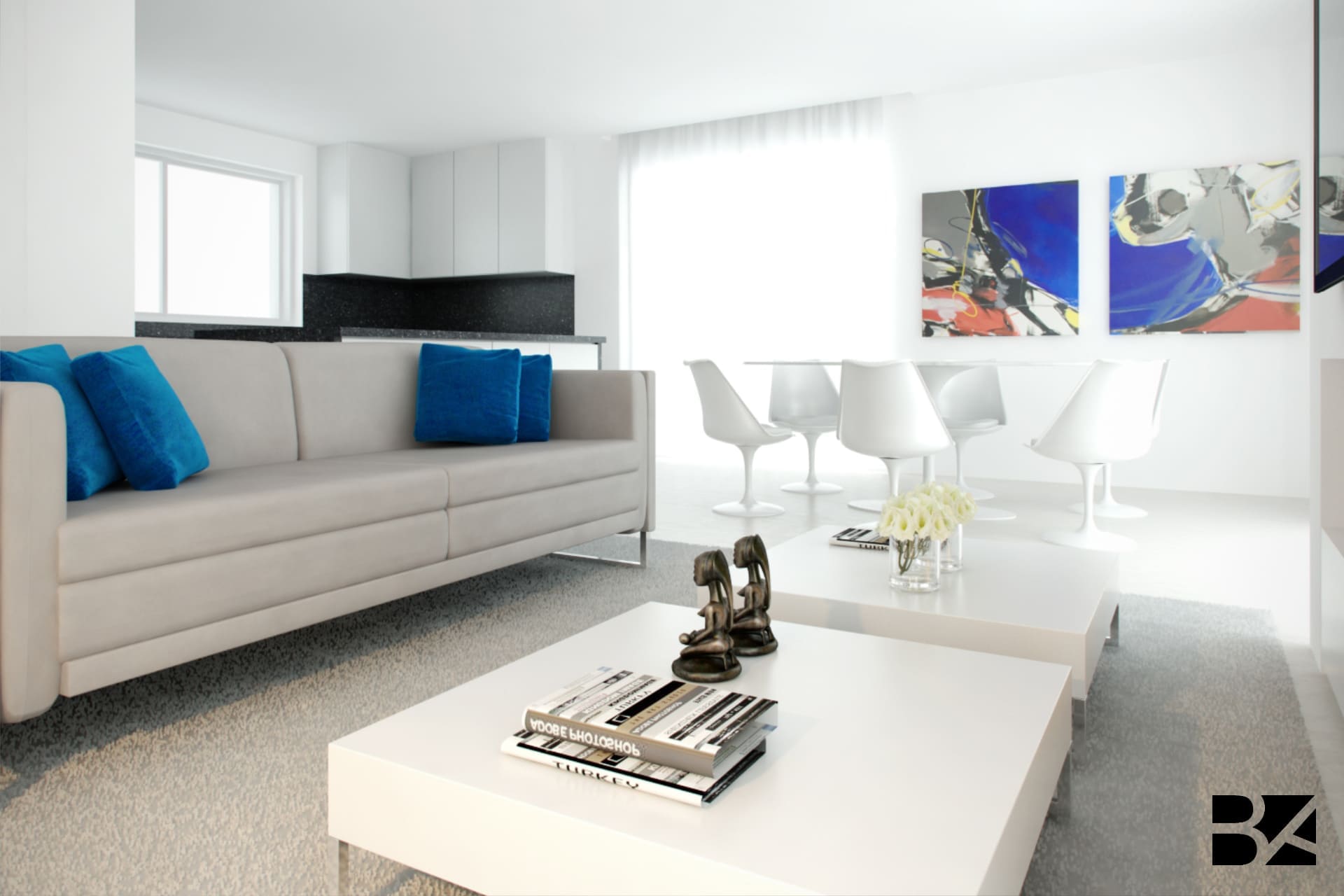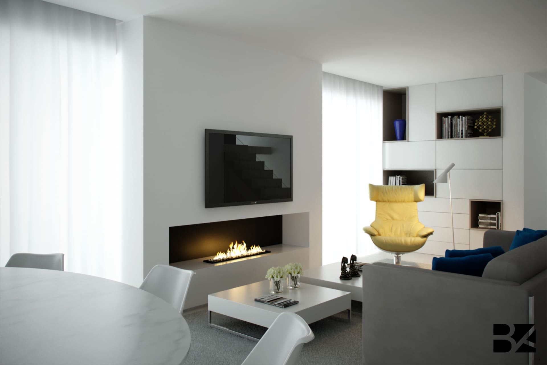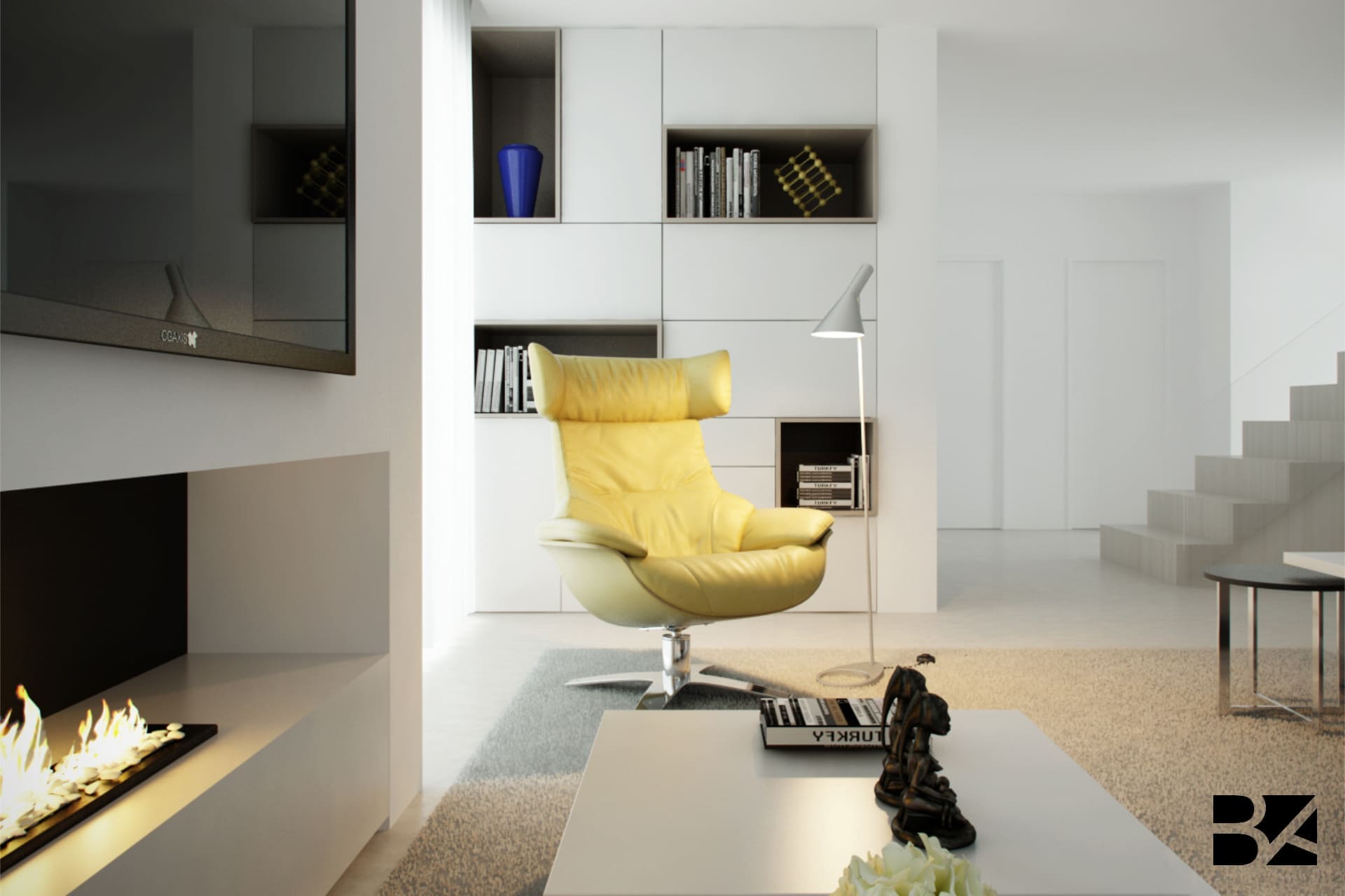 This living space captures the contemporary spirit of Berlin, with clean lines, neutral tones, and a touch of boldness. The yellow armchair stands out as a vibrant accent in a room defined by minimalist furniture and a subdued palette. The built-in fireplace and integrated television enhance the sleek functionality, while abstract artwork and abundant natural light bring dynamism and personality. A sophisticated, modern interior infused with attitude.
