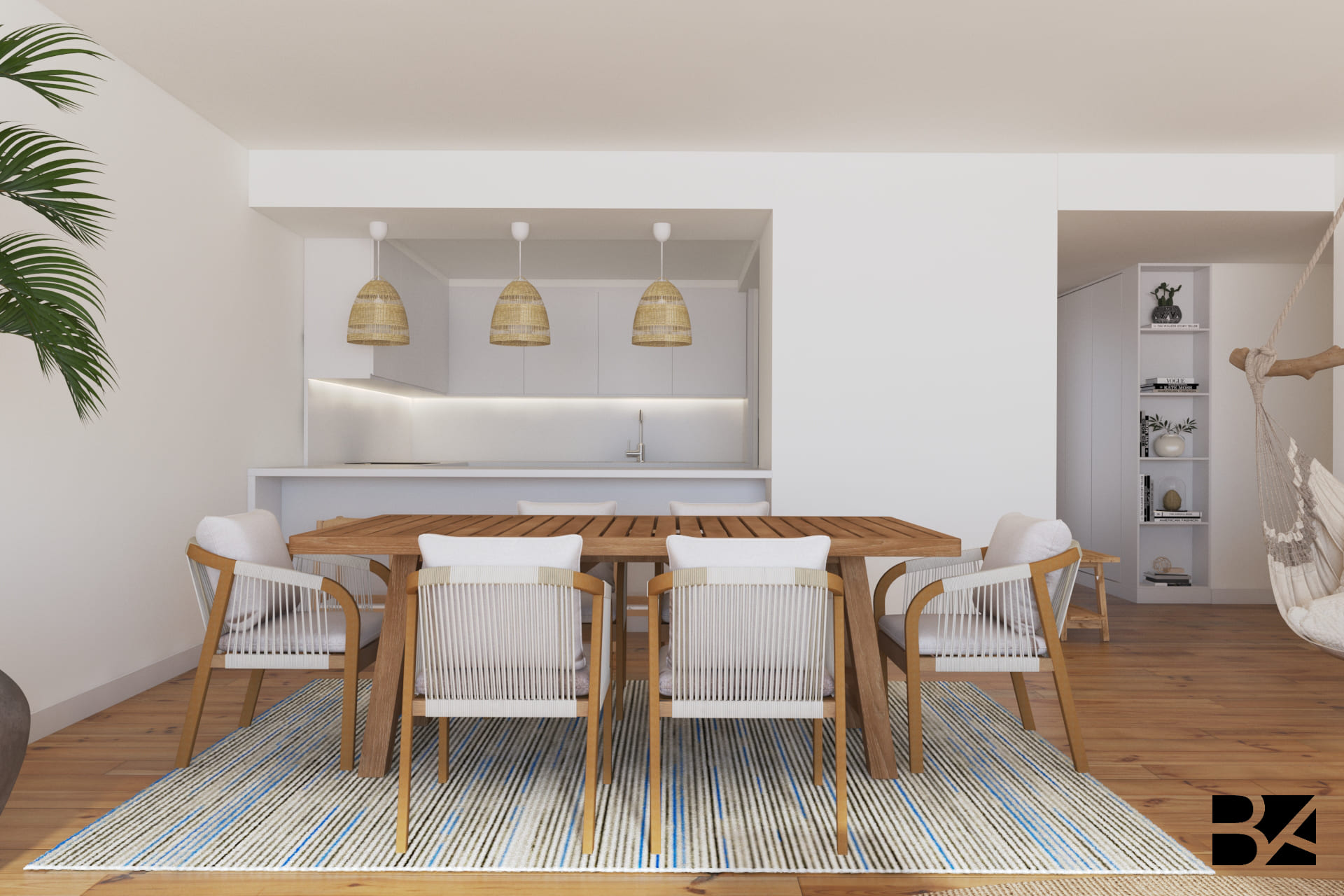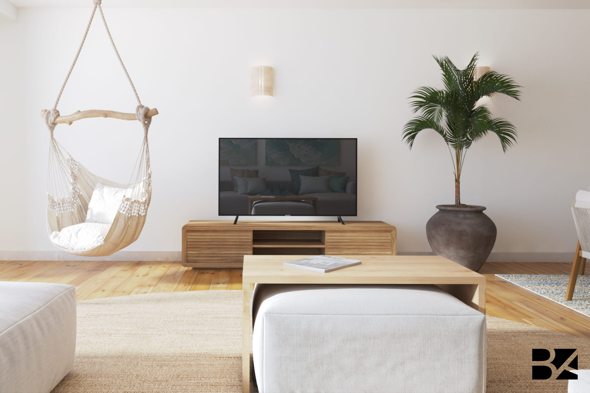 Inspired by the relaxed elegance of Ibiza, this living space radiates serenity and natural charm. Soft sand and white tones dominate the palette, enhancing the room’s brightness. A generous sofa with textured cushions invites relaxation, while the hanging swing adds a playful, bohemian flair. Light wood, natural fibers, and ocean-inspired artwork strengthen the connection to the island landscape. A space where comfort meets the free spirit of the Mediterranean.
