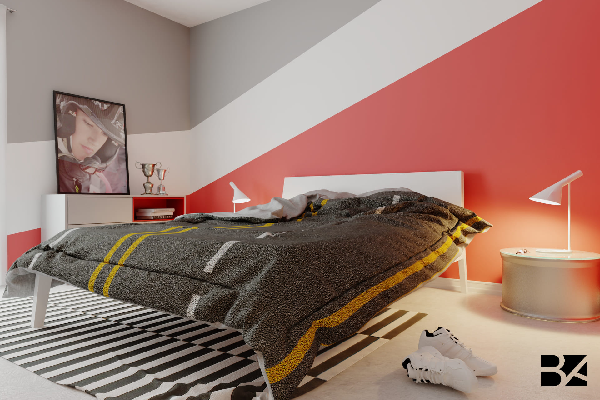 Inspired by the dynamism of Milan and the thrill of motorsport, this teenage bedroom strikes a balance between contemporary design and sporty identity. The grey, white, and red walls echo the colors of the racetrack, while the central bed, with its modern lines, stands out with grey bedding and bold yellow accents. A shelf filled with trophies and books highlights a passion for racing, and the striped rug recalls the starting grid. Finishing touches like the modern designer lamp bring sophistication without losing the youthful spirit. A space designed to dream at full speed.
