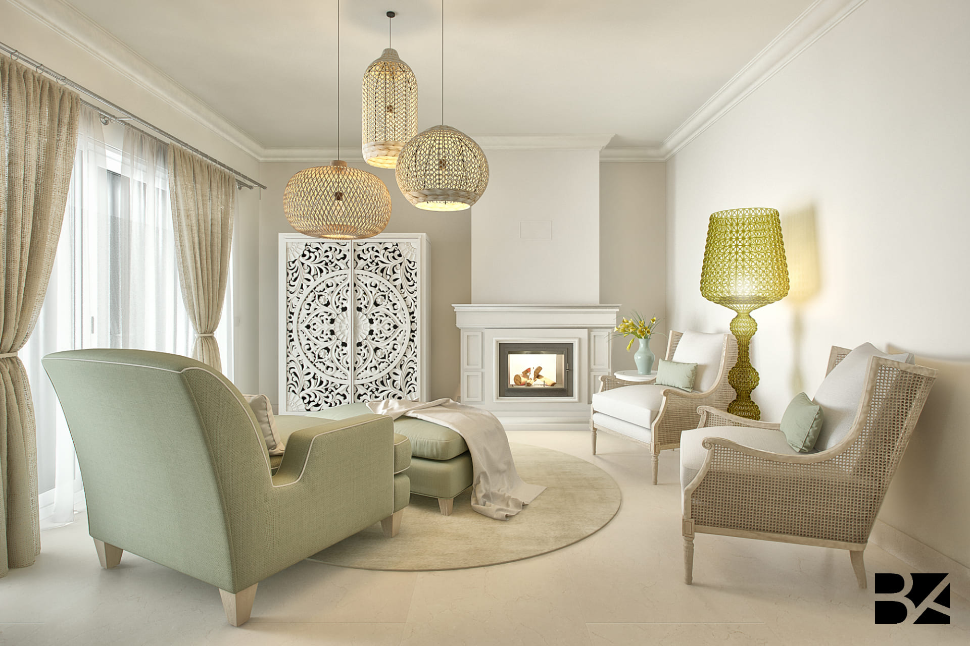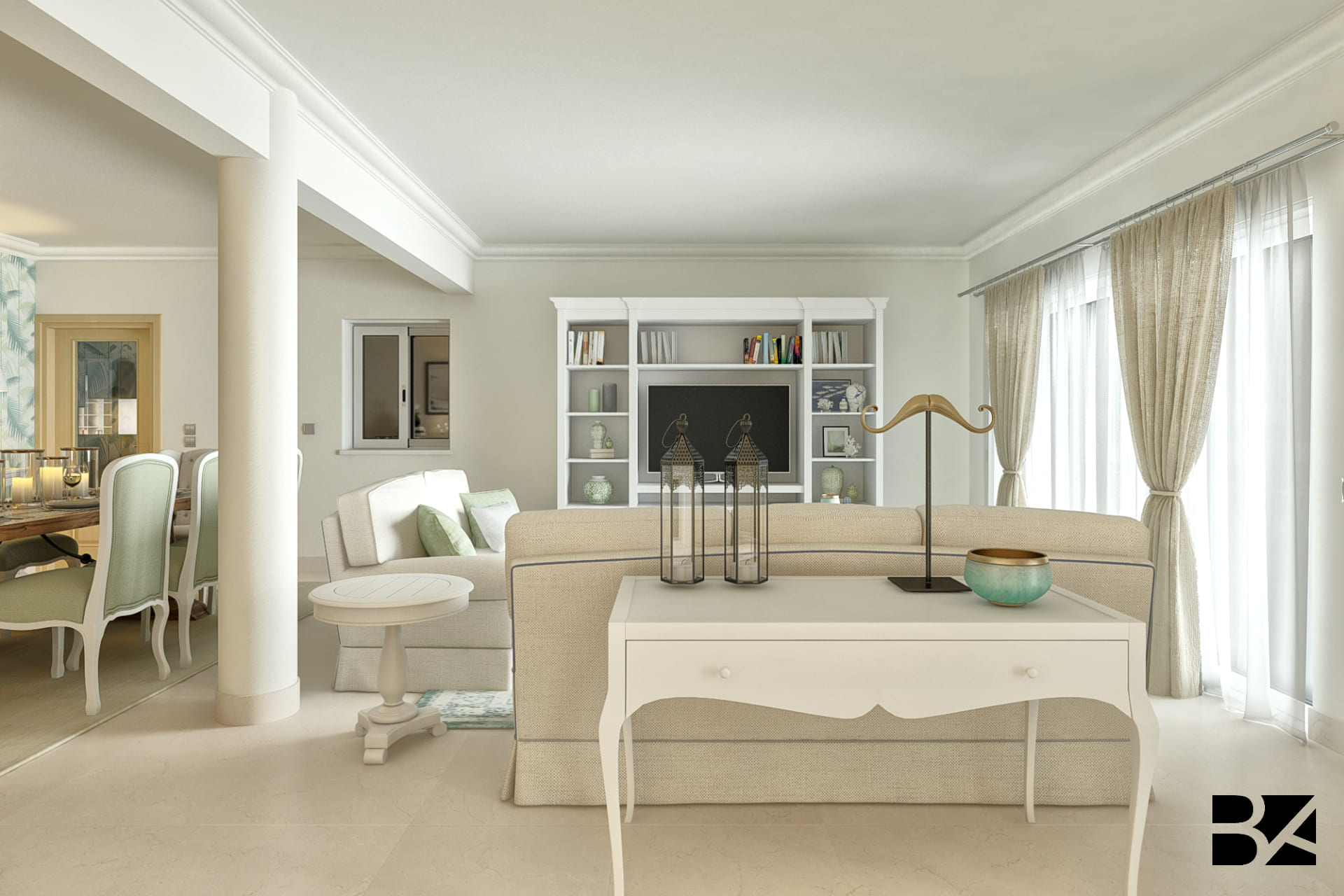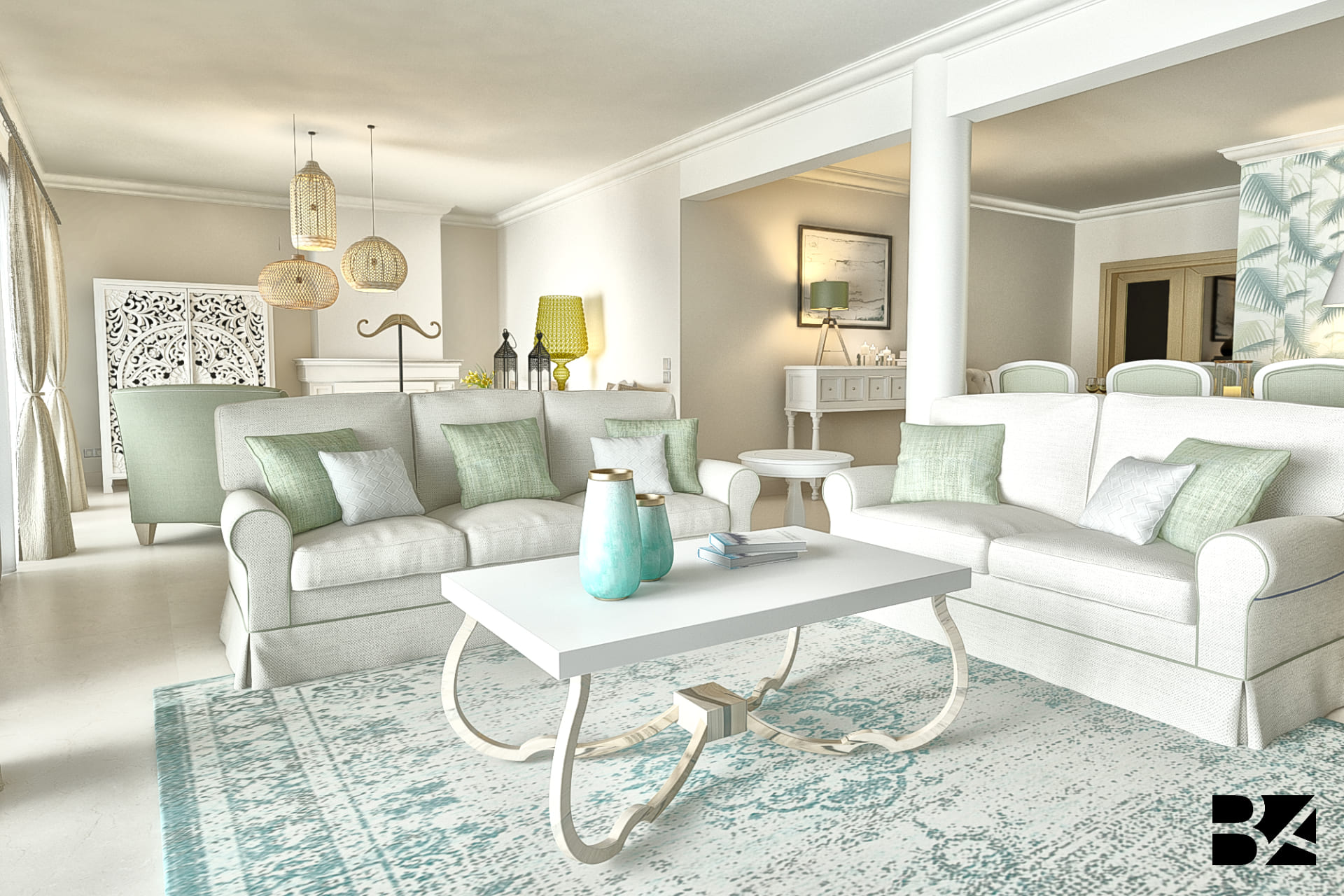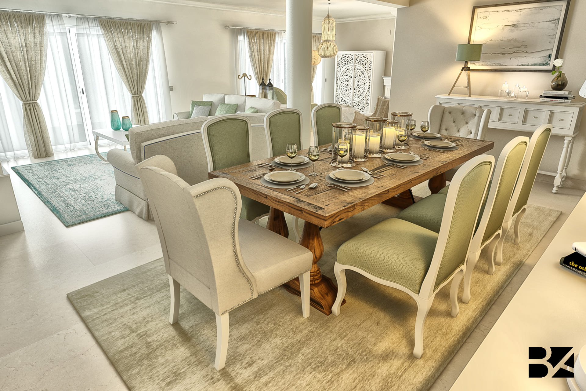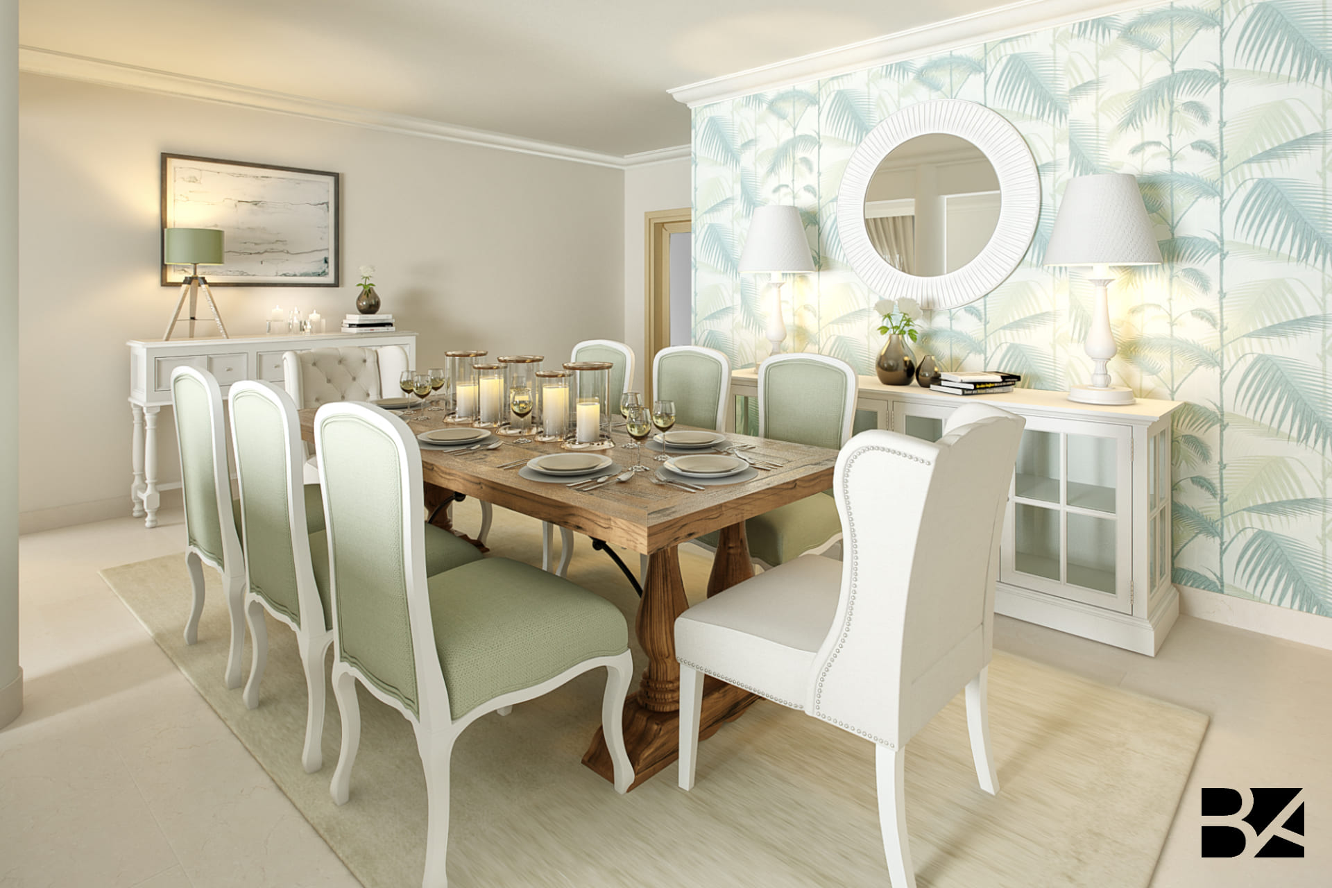 This combined living and dining area celebrates Parisian style through a harmonious fusion of classic charm and inviting functionality. In the lounge, white sofas with green and grey cushions evoke softness and sophistication, while the dining space extends the palette with a rustic wooden table surrounded by upholstered chairs in pale green and white—creating chromatic and tactile continuity. A soft botanical wallpaper brings the feel of a Paris garden indoors, and a round mirror above a sleek white sideboard enhances light and depth. Finishing touches like candlesticks, ceramic accents, and natural-fiber lighting complete the setting—where understated elegance and everyday comfort meet with quintessential Parisian flair.