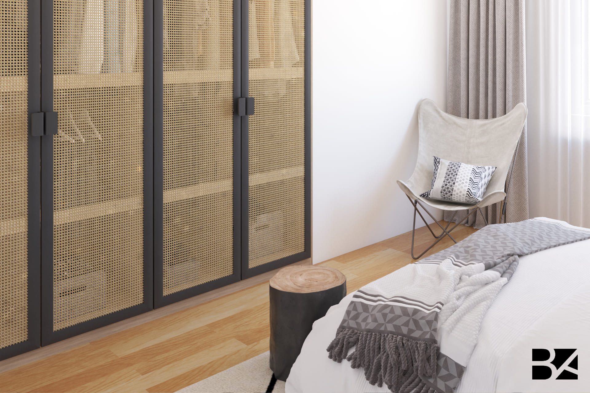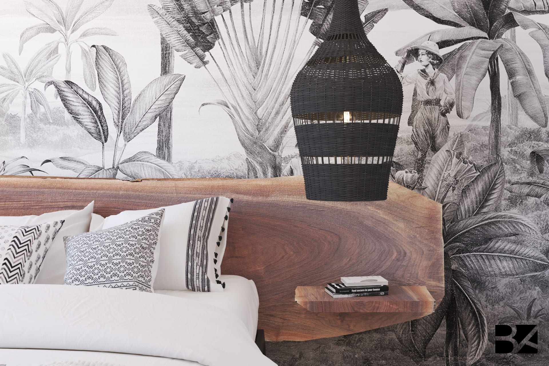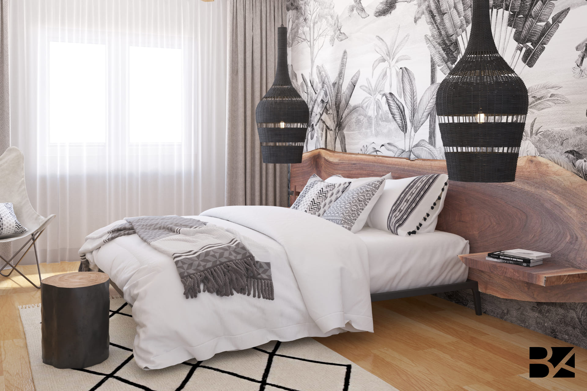 This bedroom draws inspiration from the Serengeti’s vast landscapes, blending natural textures with refined design. The rustic wooden headboard and monochrome mural featuring African wildlife echo the spirit of the savanna. Black wicker accents, a handcrafted bench, and a bold graphic rug add personality and elegance. A space where nature and modernity meet in perfect harmony.
