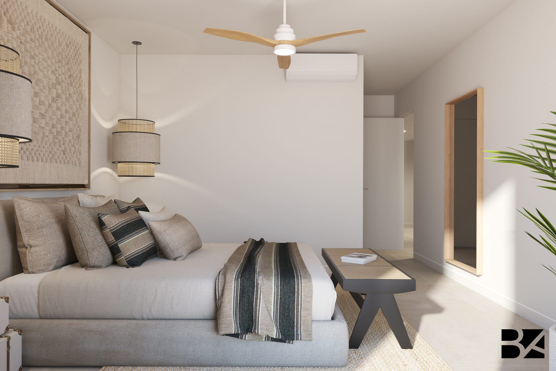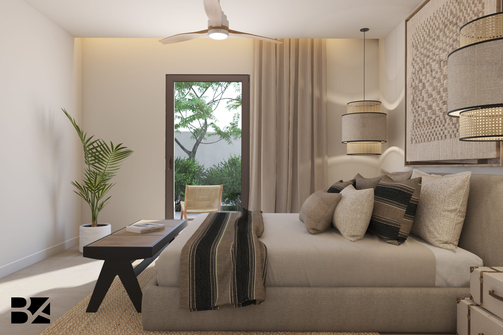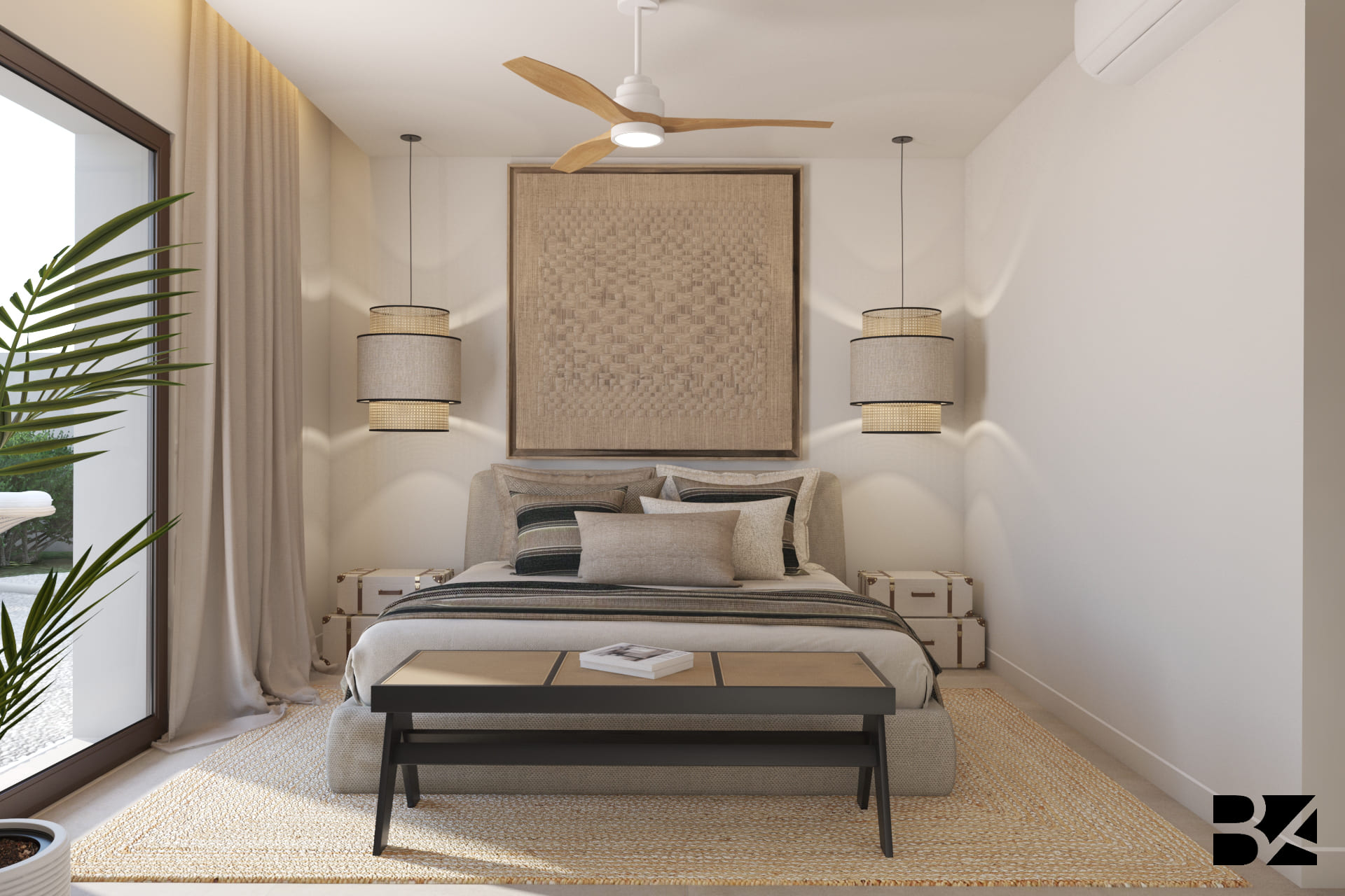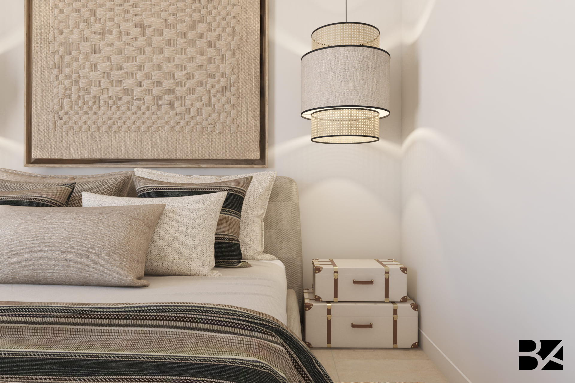 This bedroom captures the calm essence of Tanzania’s Serengeti through neutral tones, organic textures, and handcrafted details. The upholstered beige headboard, contrasting cushions, and woven wall art above the bed create a serene and sophisticated composition. Pendant lights with fabric shades, linen curtains, and a natural fiber rug reinforce the connection to nature. Vintage suitcases, a dark wood bench, and a lush green plant add personality and a spirit of adventure. A space designed for relaxation, elegance, and authenticity.