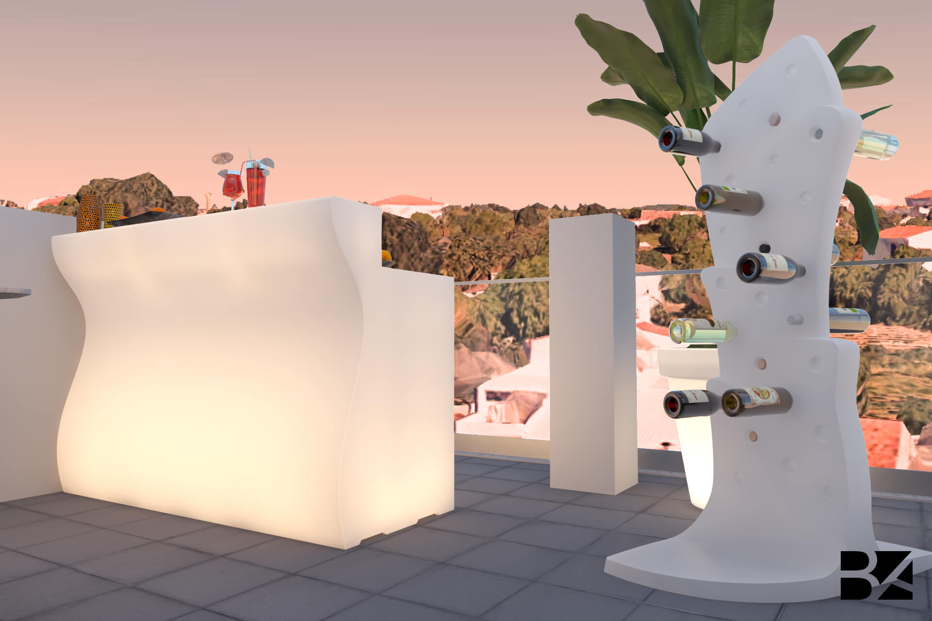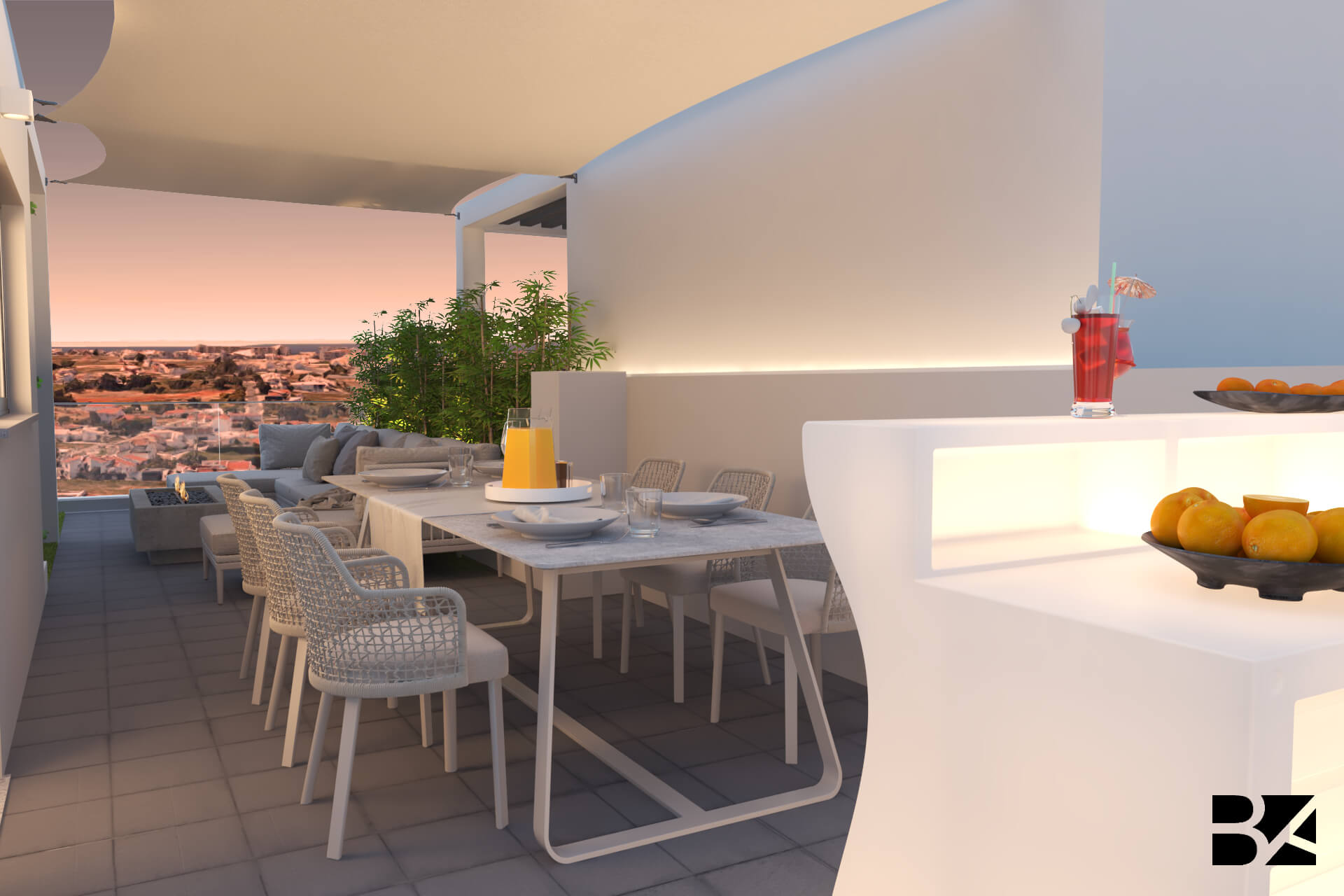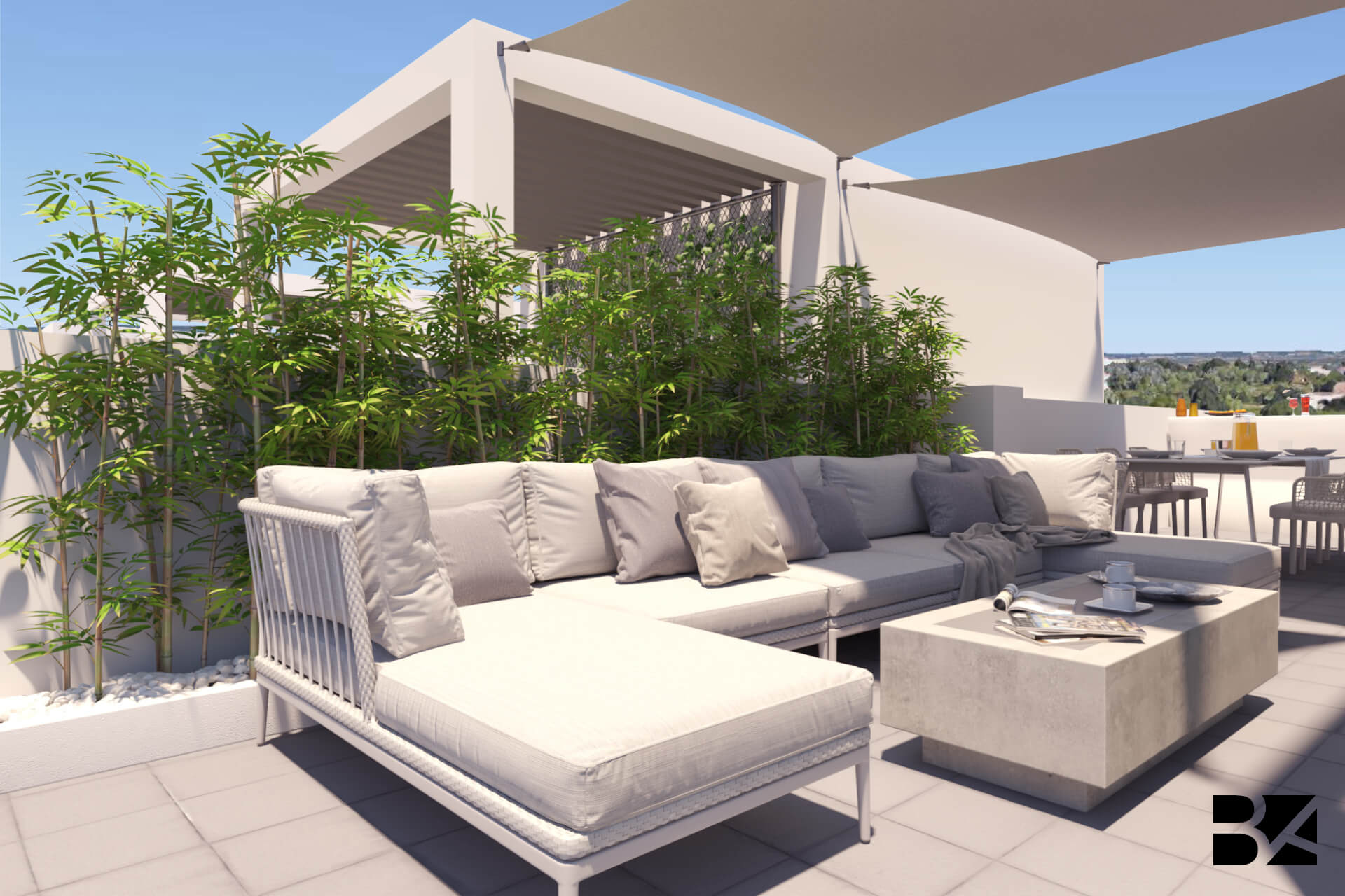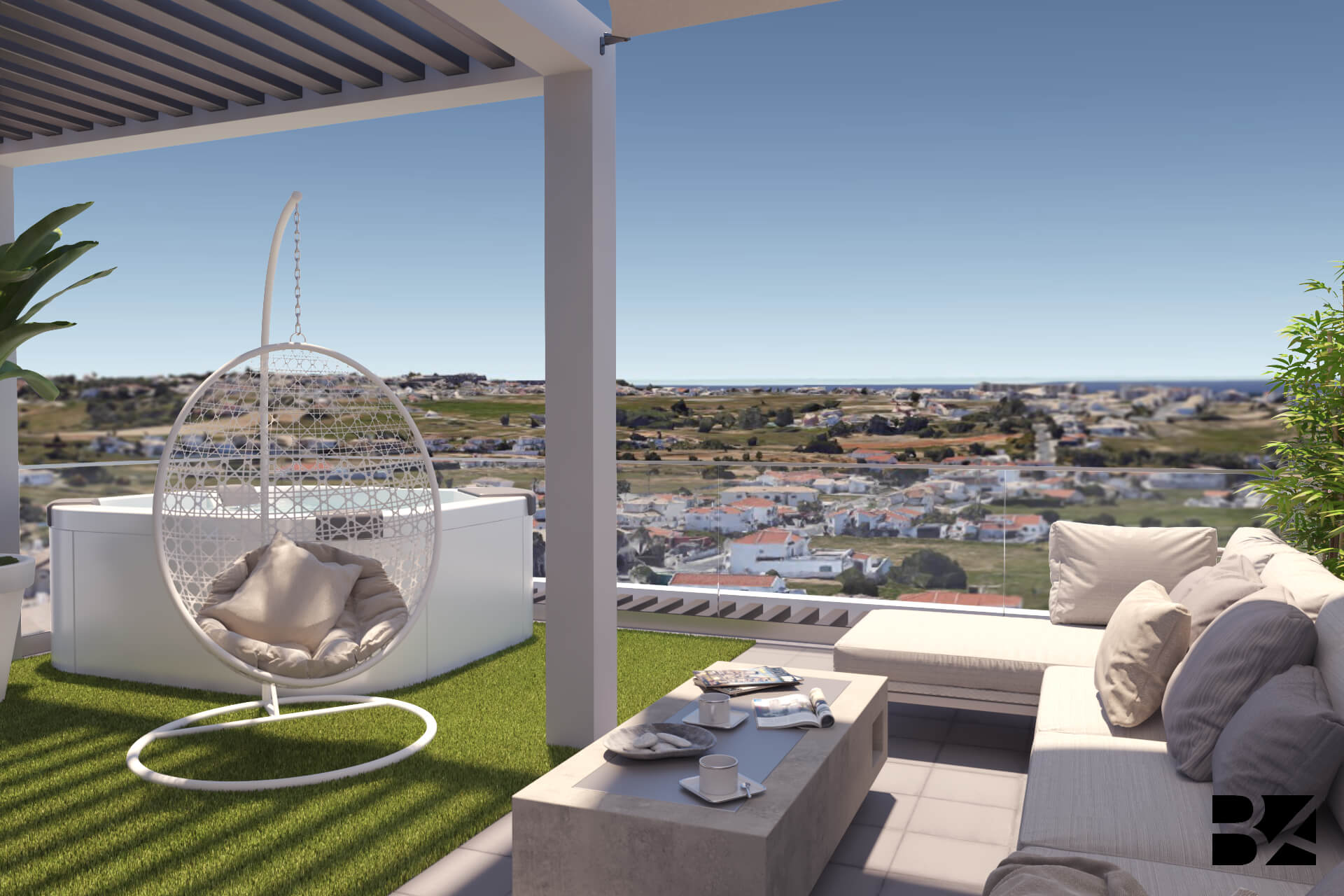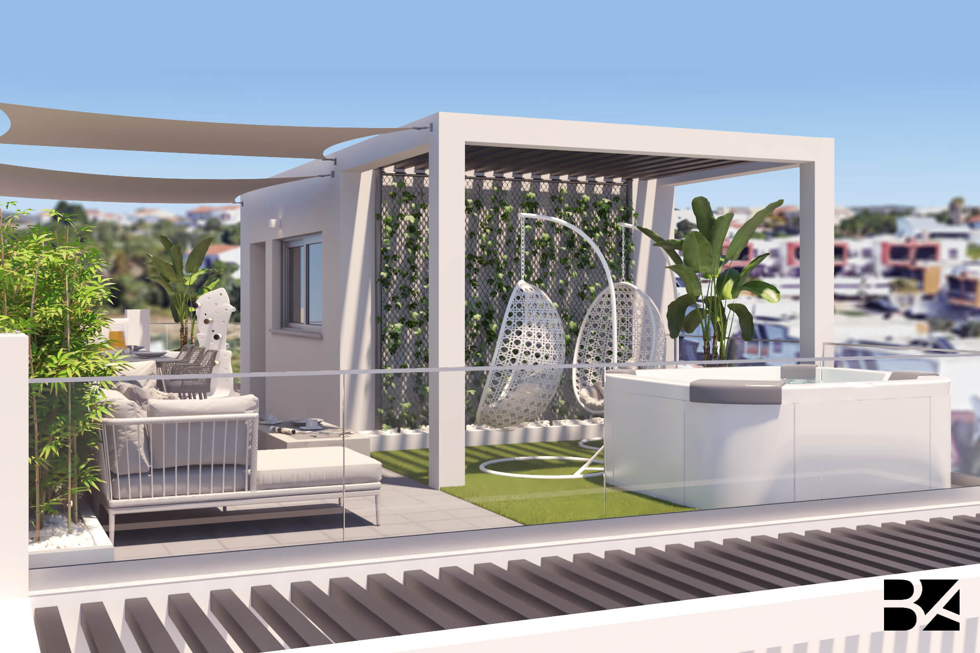This rooftop blends sophistication and leisure, capturing the vibrant spirit of Las Vegas. The standout jacuzzi offers an inviting spot to unwind with scenic views. A spacious dining area with stylish chairs sets the stage for open-air gatherings, while the generous sofa and airy décor create a laid-back lounge atmosphere. A hanging swing adds a playful touch, and the mix of greenery and sleek details bring balance-transforming the space into a chic urban retreat full of personality.